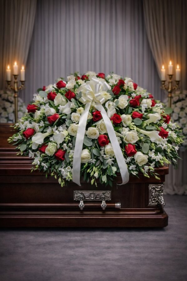 CS1550: Red and White Rose Casket Spray with Calla Lilly