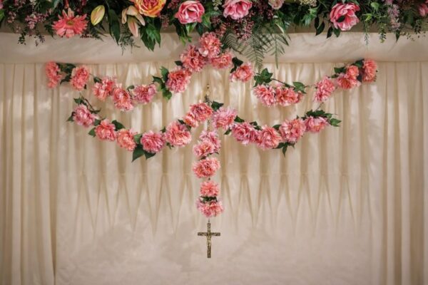 This rosary arrangement features pink carnations with a silver cross. It is a symbol of hope.