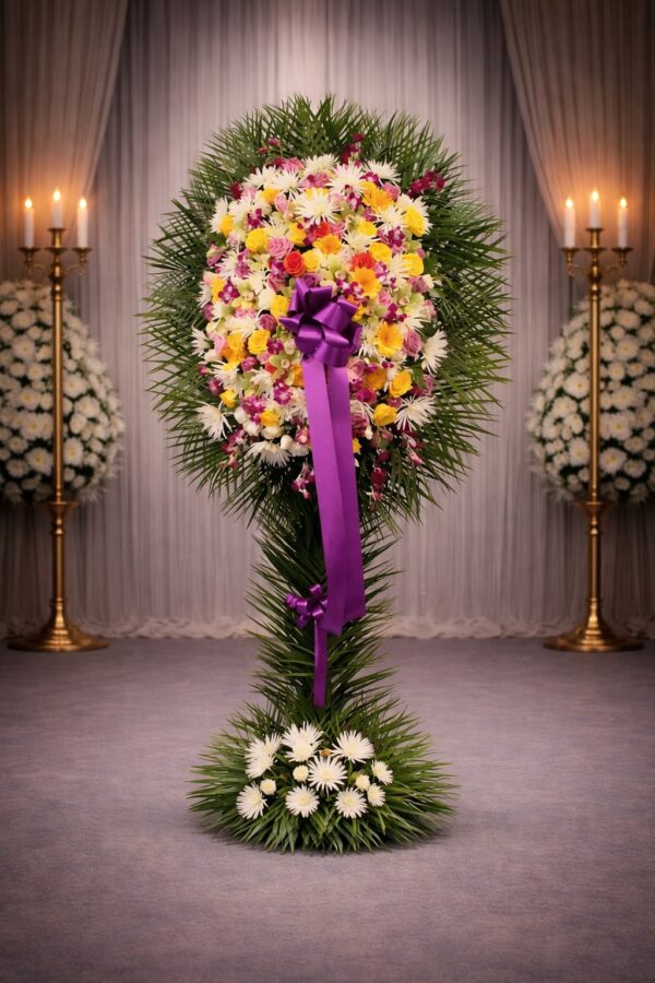 An arrangement of colorful flowers with a purple bow in the center. This bright arrangement signifies all the good times you’ve shared with your loved one.