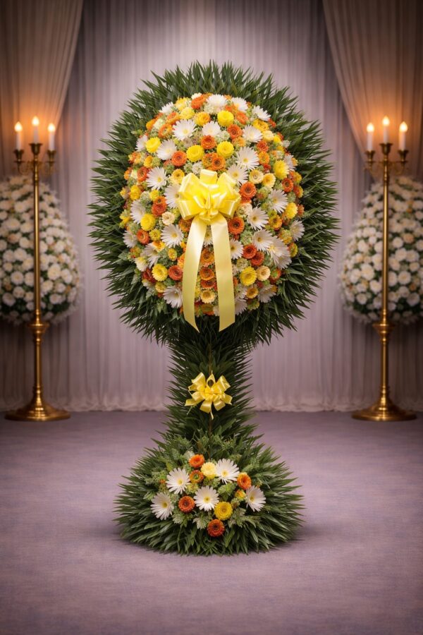 A hopeful arrangement consisting of yellow, orange and and green flowers set over palm leaves.