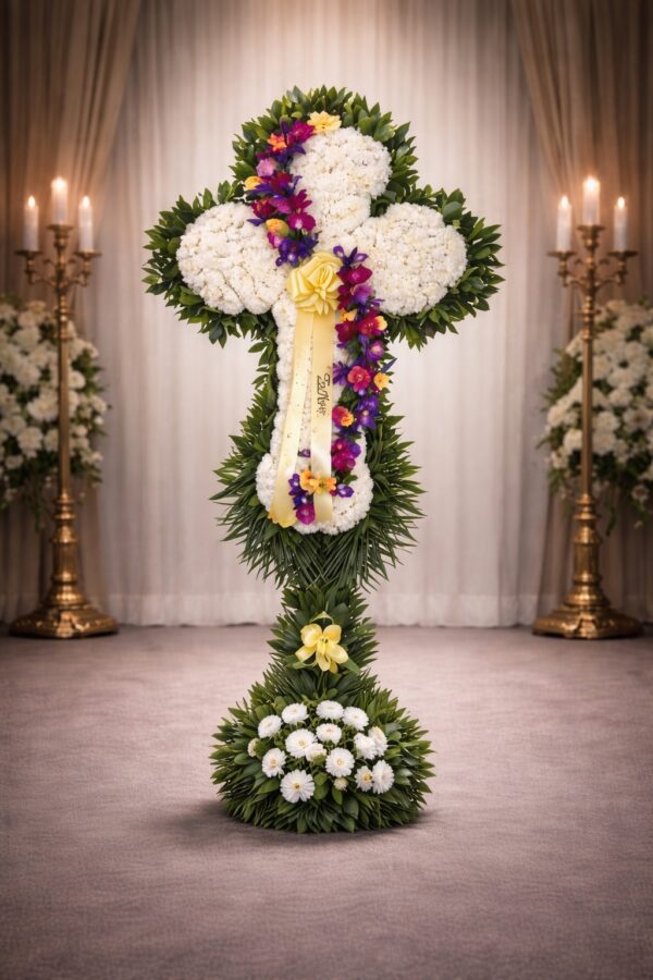 A beautiful white cross with a purple swirl of blooms against palm leaves.