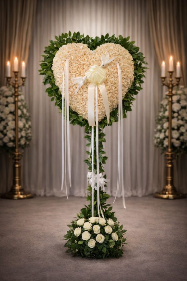 H0300: White rose bleeding heart with lemon leaf Product Description: A delicate heart with soft white roses and calming lemon leaves. $625.00 $625.00 Pricing Options Choose an optionStandard PackageSilver PackageGold PackageClear Quantity Add to cart For details, please call: 718-238-6978 SKU: H0300 Category: HEARTS Attachment