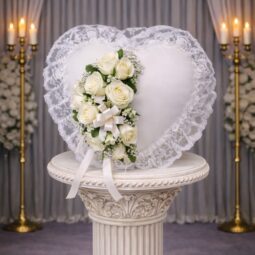 P0110: Satin Heart Pillow with White Flowers