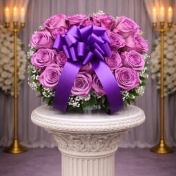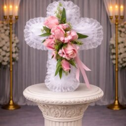 P0120: Satin Cross Pillow with Pink Flowers