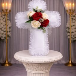P0200: Satin Cross Pillow with Red and White Flowers